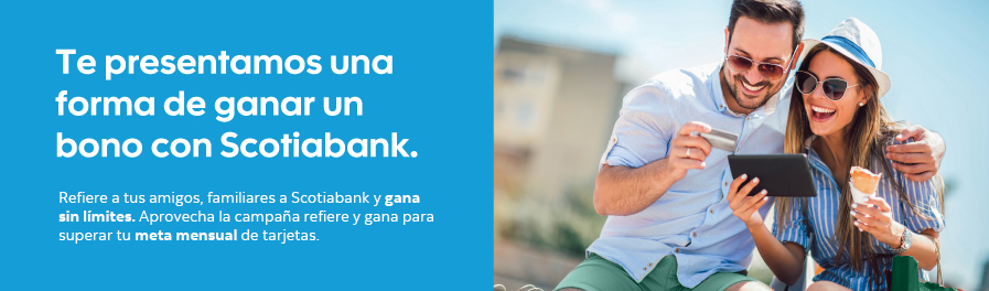 ®Marca registrada de The Bank of Nova Scotia. Aplican restricciones: Promoción válida únicamente para clientes que reciban una invitación por correo electrónico o SMS para participar y refieran a personas que no posean tarjetas de crédito de Scotiabank para ser contactados y ofrecerles dicho producto, la promoción no es transferible. El referido debe de estar anuente que será contactado por el banco. La solicitud de tarjeta nueva del referido estará sujeta a verificación de documentos y aprobación crediticia, de acuerdo con las políticas internas de Scotiabank. Promoción aplica para tarjetas de crédito de personas naturales, no aplica para tarjetas de crédito empresariales, corporativas o adicionales. Bono de $75 aplica por cada cliente referido que se le otorgue tarjeta de crédito que se active y que no posea tarjeta con el banco. El bono será aplicado como un crédito a favor en la tarjeta de crédito del referidor. El referido debe usar la Tarjeta de crédito en los próximos 30 días de la activación para que el bono se aplique, si no usa la tarjeta de crédito en el mes siguiente no se acreditará el bono. Esta promoción es por tiempo limitado y estará vigente durante los meses de febrero 2023 a abril 2023. El banco cuenta con hasta con 60 días hábiles para aplicar los bonos.
